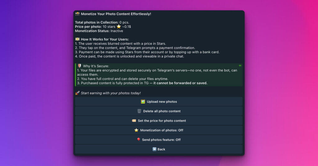 - 💲 Установить цену на фотоконтент: Определите или измените цену (в Telegram Stars) на ваши фотографии.