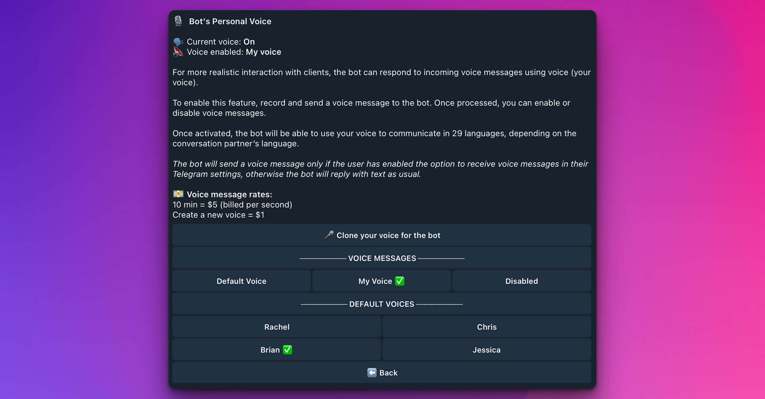 - How it works: To enable this, you’ll typically record and send a voice message directly to the bot (or through a specific interface within the settings). The system then processes your voice sample to create a clone.