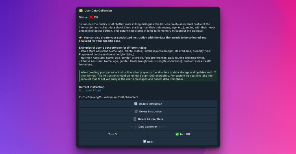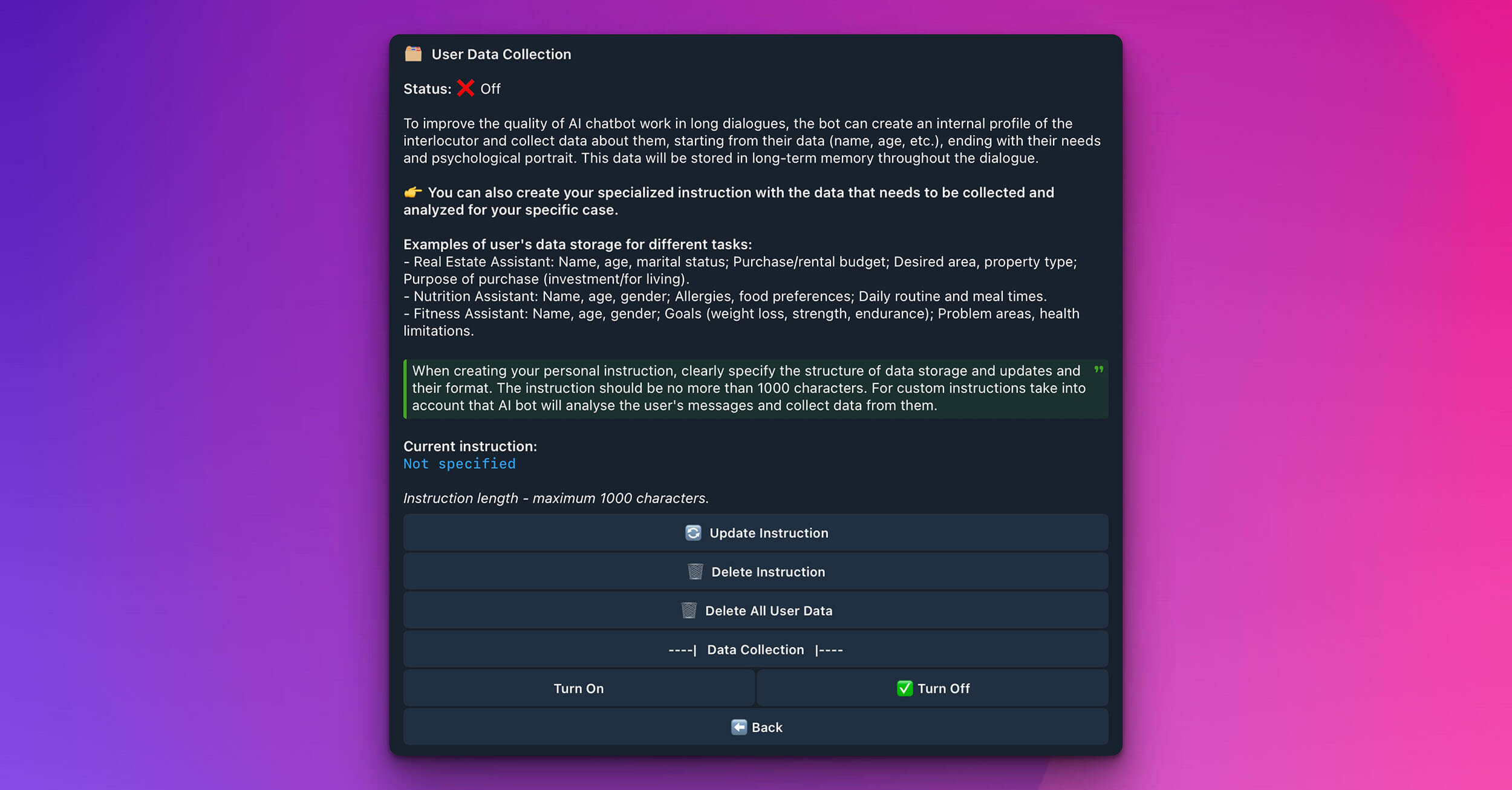 • 🟢 Turn On: Activates the User Data Collection feature. The bot will start building profiles and collecting data based on your instructions (if provided) or its general capabilities.
