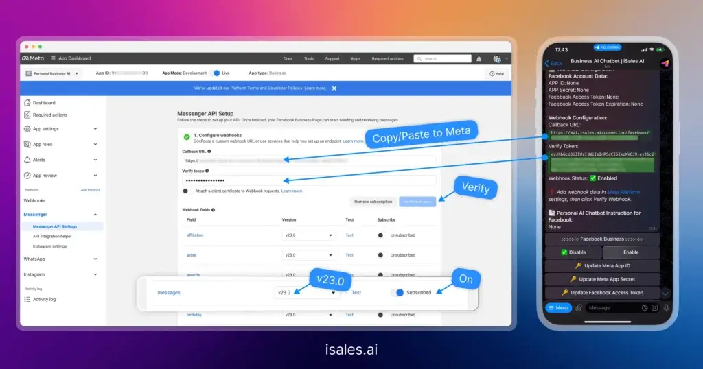 • Paste the Verify Token from iSales AI into the “Verify token” field on the Meta platform.