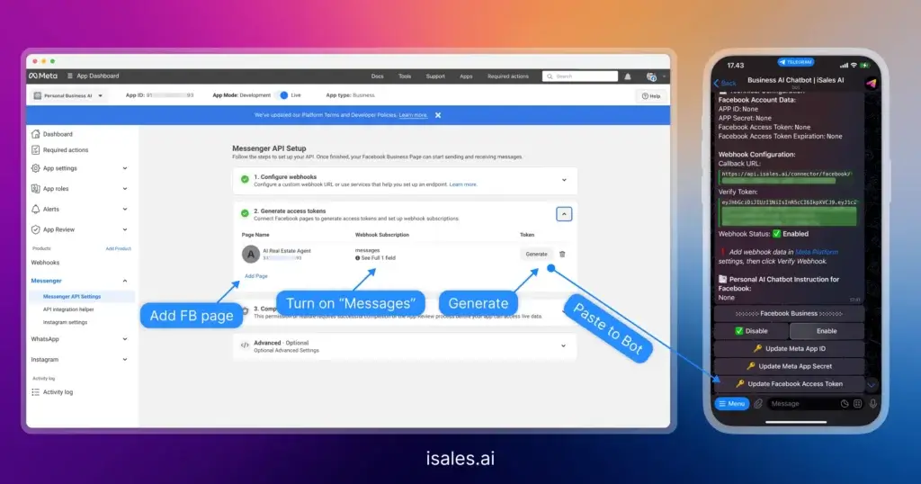 • Facebook Access Token: The Page Access Token that authorizes iSales AI to interact with your Facebook Page’s Messenger.
