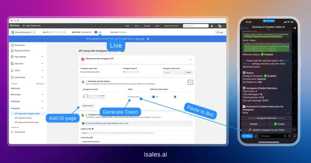 Connecting your iSales AI Chatbot to Instagram Business requires setup on both the Meta Developers Platform (developers.facebook.com) and within your iSales AI settings.