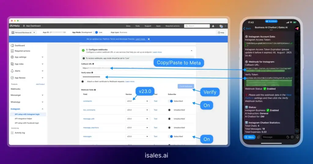 Callback URLandVerify Tokenprovided by iSales AI for Instagram. Copy both of these values. (They might be the same or different from the WhatsApp ones, ensure you use the Instagram-specific ones if provided separately).
