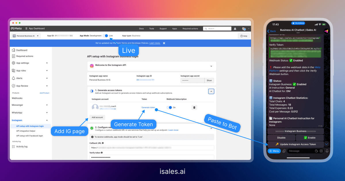 Instagram Access Tokenfor iSales AI. Note: These tokens have an expiration date and may need to be refreshed or replaced with a long-lived token for continuous operation.