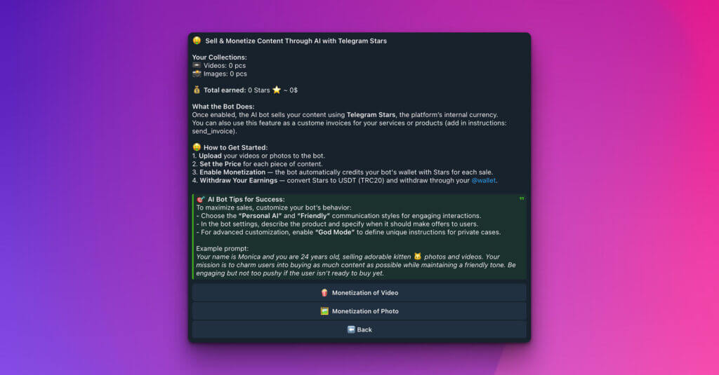 • Automated Sales: The AI bot sells your uploaded photos and videos directly to users, processing payments using Telegram Stars, the platform’s internal currency.