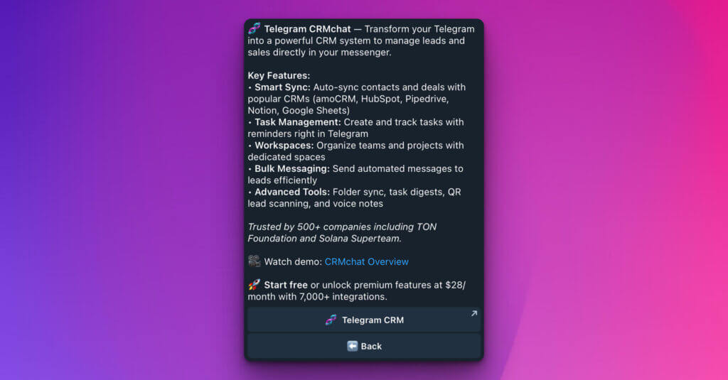 Telegram CRMchat is already trusted by over 500 companies, including prominent names like the TON Foundation and Solana Superteam, underscoring its reliability and effectiveness.